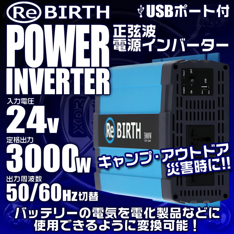 防災グッズとして停電時の電源確保に役立ちます!! 商品仕様 入力電圧:DC24V 出力電圧:AC100V 定格出力:3000W 出力周波数:50Hz/60Hz切替 出力仕様:ACコンセント(2口)、USBポート(1口) 出力波形:正弦波 USB出力:DC5.1V/1.0A 使用温度環境:0℃〜40℃ 本体サイズ(約):410mm×235mm×100mm 重量(約):4.4kg 商品機能 入力低電圧警報音 入力過電圧保護 入力逆接続保護機能 低電圧遮断 過温度遮断 過負荷遮断 回路保護 短絡遮断 商品内容 インバーター本体 ×1 バッテリー接続コード ×4 日本版取扱説明書 ※USBケーブルは付属しておりません。