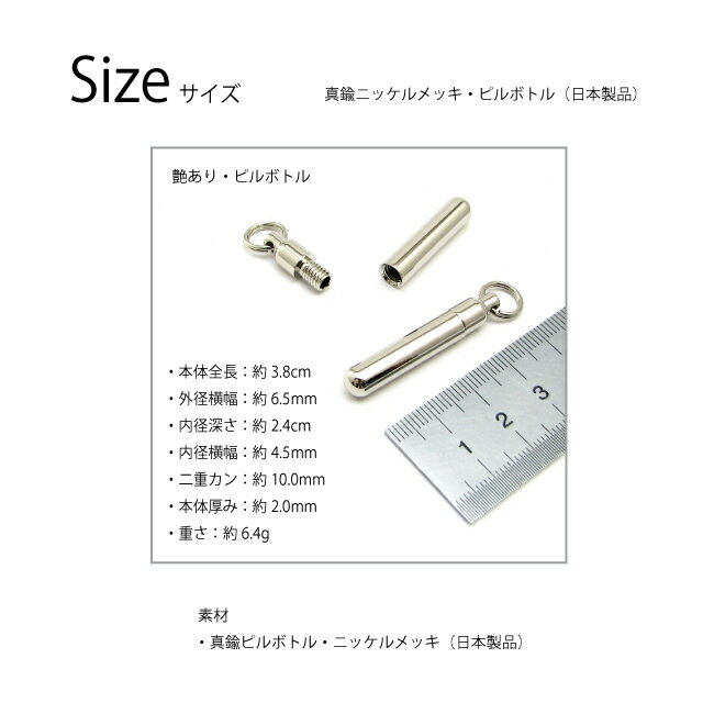 ■商品詳細サイズ・本体全長:約3.8cm・外径横幅:約6.5mm・内径深さ:約2.4cm・内径横幅:約4.5mm・ゴムパッキン:無し・本体厚み:約2.1mm・真鍮二重カン:約10.0mm・重さ:約6.4g素材・真鍮(ニッケルメッキ)カラー色目・ニッケルシルバー■ご注意※ネット環境やモニターにより色の見え方が実際の商品と異なる場合がございます。